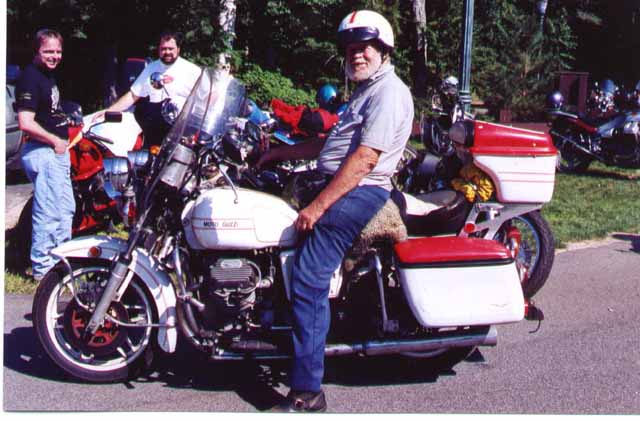 Things are done differently near the Canadian border! I went back to the beer tent and asked for a hotdog to go along with the beer I was drinking. As I stood there and chatted with other Guzzists, I noticed the kid that was cooking. Must have been a North Woods camping thing. There was a complete neglect of basic food handling sanitation. The young gentleman of junior high vintage was scratching his nose and handled the money, hotdog, the cheese and bun with bare hands. Cooking utensils were right in plain view and no effort made to use them. In the middle of this process, his father came over to check on things. He also handled the food with bare hands. No effort was made to use the barbecue tools either. After I took ownership of the questionable dawg, I decided that I should say something to the dad about kitchen sanitation. While I was attempting to explain to the father about what happened, his wife came up and said, "What do you expect? We're camping!" I retreated after that explanation and made a mental note to turn down any invitations for their house. I just didn't feel that it would be right to share germs without a proper introduction. Fortunately, I have a strong constitution and use a lot of hot sauce when I eat, plus the beer probably killed some of the gems, at least I'd like to think so.