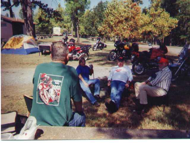 About a dozen or so riders had already set up their tents and pop up campers. Being relatively new to the Guzzi Clan, I didn't know but about half the bikers there. But with it being a small, friendly group, it didn't take long for introductions to take place. I met some folks that I have read about in the MGNOC newsletter or "met" on the Internet correspondence lists. One guy was limping around the campground with a slit cut in the knee of his jeans and showing off his knee bandage. I think he was trolling for sympathy - you know the kind. I believe the story was that his Guzzi and camping trailer did a donut in the parking lot and he went down. All okay though.