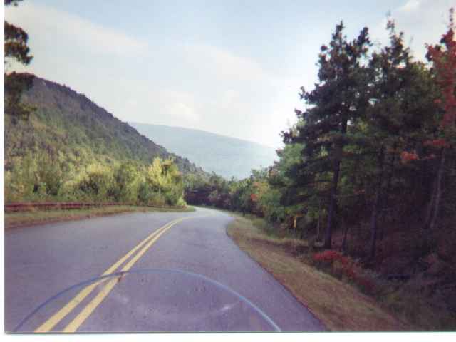 Early the next morning, a few campers were already up, stirring around the campfire, drinking coffee. I packed my camping gear on my EV, drank a cup of coffee, said good-by, zipped up bags and jacket, headed east again along the Talimena Drive to Mena, Arkansas, point of the eastern terminus. I was planning to stop at the Queen Wilheimena State Park located about half way on the Drive for another cup of coffee, but the restaurant parking lot was full, so I continued on. High winds, relatively low temp, and overcast skies undoubtedly kept a lot of motorcyclists at home, but there were still a few out, like myself, fighting the winds on the hilltop road. They were probably heading home like myself.