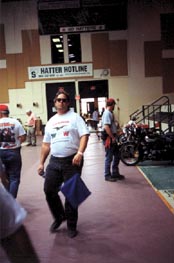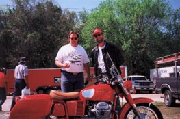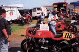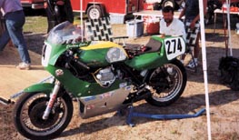 Daytona always makes me want to clone myself so I can attend all the conflicting events happening the same day or evening 15 miles apart. We picked one or two things to do each day, and, depending on who else was at the camp, had decided to do the same thing, headed out to Deland or Daytona en masse and were gone all day. Eppa, Ron, and Cliff always seemed to be up and gone by the time I got motivated. I could never figure it out. We hit the AHRMA tech session, which was held at the AMI facility on Highway 92 just west of Daytona. All the beautiful vintage and not-so-vintage bikes were being scrutinized, and we saw several old friends from the Guzzi universe. Todd Ross, Guzzi/Aprilia dealer in Port St. Lucie, Florida, had his custom-framed Guzzi racer there, and Michael Long, new owner of Cycle Specialties in Athens, Georgia, was there helping tune a Ducati racer. Charlie Cole's beautiful green and silver round-head racer was there too. We drooled, talked, bought magazines, and took pictures in the wonderful sunshine. Everyone was happy; it was planet of the motorcycles.