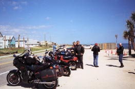 On Wednesday, or was it Thursday, local Guzzi guy, Jim Lucia, and Jim Sucharski had arranged a Guzzi ride heading out from Stetson University. We rode to Flagler Beach for lunch, via the Ocala National Forest, and for the first half of the ride I was being tortured. A LeMans V at 55 mph is not a fun thing. A pair of really old hand-shift Indians had come along, and the guys leading the ride didn't want to leave them in the dust. Unbeknownst to the leaders (and to me) the Indian riders found the back roads we were on too bumpy and had pulled off. We ate lunch at the Snack Jack on the beach, and because we were lucky enough to arrive before the lunch hour crowd, our Guzzis got pride of place in the parking lot. A film crew was shooting as we rode out, but I have no idea who they were or what they did with the footage. At lunch we decided that, since the Indians were no longer with us, we could "pick up the pace" a little on the second half of the ride. Any cruising 45-degree V-twins were fair game after that, and we passed all we came up behind.