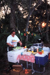 Tip immediately, well okay, later that day, set up his camp kitchen, and he and Tommy made us great breakfasts, real coffee, and delicious salads. We did most of our dinner time eating away from camp, but we did have one whopper of a spaghetti dinner one evening. I was born in Florida, and for me, Florida means one thing, and it's not hanging chads. When I am in Florida, I do seafood. We got a tip from a friend of Mark Tenney's who was racing a MuZ in the singles class. The tip was about a place called the Ormond Crab Shack. It was a shack, corrugated steel and just big enough to hold the steamers and broilers and four very harried order-takers, but the food was fantastic. I placed my order for stone crab claws and then went to the water's edge to pick out a table. Did I mention that all the seating was outside? While you were eating, beer was free. We all chowed down, those eating the stone crabs whacking away with silly little wooden mallets, watching a beautiful evening fall in Florida. Looking out over the inlet, you could almost forget the overdeveloped Hell that most of Florida has become.