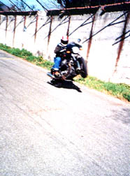 Ken got out on the track to get a shot of the guy as he passed on his next circuit. The Centauro stopped; the pilot talked with Ken for a moment, then roared off again. Ken shouted to me that he was going to do a wheelie on his next pass, so I also jumped out there to record the event. The dashing dude popped his wheelie, we captured it on film and then returned inside to finish the tour. The test pilot was in his glory as he rode the bike back inside, stepped from his steed, and was surrounded by the wide-eyed boys. He was the exact image of the World War I ace - scarf and all - who had just landed at the aerodrome after yet another successful mission against his brave and glorious adversaries, and was being congratulated by his ground crew, as he made his way to the debriefing room and a cold beer. He had that impressive swagger. As he passed us he stopped Ken and asked if he'd send him a copy of the photo.