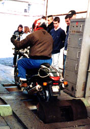 Our dashing pilot pulled his new machine onto the dyno and proceeded to rev her up. The boys watched m wonder and envy as the Centauro roared mightily. I found myself wondering how a brand new engine takes to being run up to such extreme revs, while under such a load, before all those parts have had much of a chance to get to know each other. Our test pilot loved showing off for the boys, and after the dyno slowed, he popped the bike off the machine and roared out onto the test track. The track must be less than half a mile long, since it was but a handful of seconds before he reappeared, blasting on by the admiring young men.