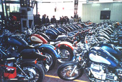 Presently we came to the final assembly area. It seemed to be a California day... Cali pieces and parts lay everywhere. I guessed that it makes sense to assemble a bunch of similar models at one time. In this section we did see individual guys putting the bikes into their final forms. The assembly area is huge, with row after row of gas tanks, fenders, handlebars, etc.