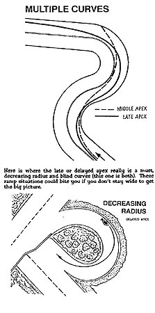 When should you use an early, middle, or late apex? For increasing radius, constant radius, and decreasing radius/limited visibility curves-in that order. When a curve's radius increases, the early apex works because the road straightens out as the radius increases. The constant radius curve is increased the most (remember changing the radius of the curve) by selecting a middle apex. When you have a decreasing radius or a curve with limited sight distance, stay wide as long as possible. This way you have the most visibility around the turn as well as a better path of travel for when the road gets tighter. Remember, if you encounter several constant radius curves together (a mix of left and rights), don't choose the middle apex for the first or any of a curve set. Selecting the middle apex puts you in a bad position to enter the next curve. Selection of a middle apex puts you in a position to run wide in the next curve. For multiple curve sets, choose the late apex. It will put you in the best position for the next turn.