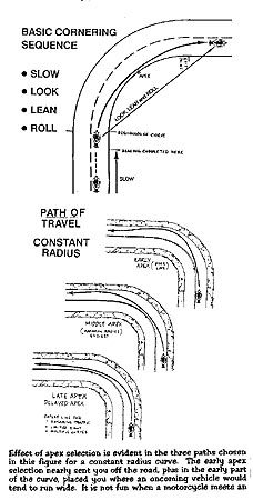 Slow look lean and roll, no matter the corner, that's the technique to use. The following illustration gives general guides on the cornering sequence. As with painting or doing auto body work, if the preparation is good, the finish coat is beautiful. By preparing well for the corner, adjusting to entry speed, looking well through the curve to select your apex and exit point, and providing a gentle roll on, the finished product is a thing of beauty.
