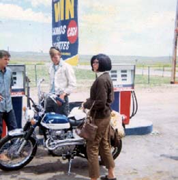 It wasn't long after moving to the flatlands of western Kansas that I was hooked on Guzzi. A local rider was kinda famous in the area for his hard, long and fast rides on his 1967 V-700 Guzzi. Talking with this rider made me a believer in Guzzi, and Don was ready to make me an owner. Mary Jo and I were poor, but Don kindly took my Norton in on trade. On April of 1968 Don wheeled the 700cc Moto Guzzi out of the shop's door (an ex gas station) and told me to take it home and pay when I could. As he pushed the V-700 out the door, he told me, "The Norton is faster, but the Guzzi will get you there quicker."