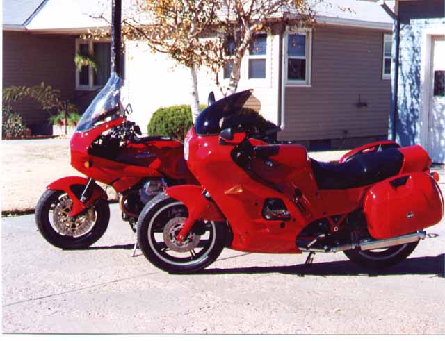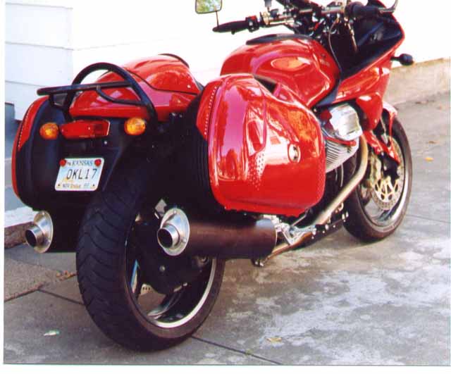 Since my most recent article about the V11 LeMans appeared in the newsletter, I've added a pair of RED Givi 46 liter saddlebags. Dave Zecha (see his article about his '86 RED LeMans IV in the January, 2003 newsletter) put me onto these bags. He bought a pair of 40 liter Givi saddlebags for his LeMans and we found out the red color was almost a perfect match to the 2002 Ford pickup truck Bright Red