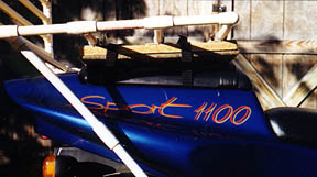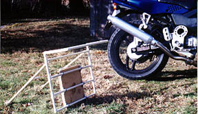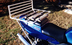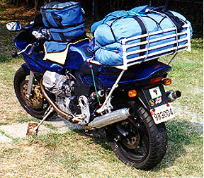 To overcome the limited carrying capacity of my 1996 Sport, I fashioned a luggage rack which occupies the passenger seat. It is very simply constructed, using 1/2 inch PVC water pipe. The whole thing cost me less than $25. A piece of wood forms a base, with an old carpet scrap glued on to protect the seat. The rack is secured to the bike with a couple of nylon straps running underneath the passenger seat. For extra stability I ran two struts down to the passenger footpegs. I initially had some trouble with the struts wanting to rub against the body work so I added some short stabilizers in the middle of the struts. I removed the two Allen screws, which hold the tailpiece on and replaced them with hex head bolts inside PVC pipe caps so I could slip the stabilizers into the caps. After I've arrived at my destination, everything comes off the bike without leaving any obtrusive hardware, and the rack goes inside my tent to give me a convenient place to dry my towel after a shower. The 1/2 inch pipe is reasonably strong and just the right size for bungee cord hooks, giving me plenty of places to secure the load. I use a "cargo net" over the massive pile to keep everything together and add a couple of extra bungee cords here and there for the last bit of peace of mind. The "fully loaded" picture includes: a tent; a large waterproof duffel bag containing my sleeping bag, ground pad, usually a couple of towels, and whatever small items I can fit into the nooks and crannies; a protective cover to keep the dew off the bike at night; and on top another small bag containing my rain gear. (We all know that one of the fundamental rules of motorcycling is if you have your rain gear handy, it is much less likely to rain.) The large tank bag holds most of my clothing in the expandable top compartment, with a few extra tools, tire patch kit, etc. in the bottom. It's tall enough that I sometimes lean on it. The tank bag has its own rain cover and attaches with magnets. I use a $5 synthetic chamois made for washing cars under th e tank bag to give a little extra protection for the paint on the gas tank. The bag is very stable, never moving at all, and I have encountered some pretty strong wind gusts on two lane highways from passing semi trucks. I can definitely feel the extra weight with the bike fully loaded, but the handling is still stable and sure. I've never had any problems with the load, but I'm also careful to take it easy and keep the speedometer out of the three digit range.