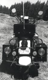 During this entire process, I was on a mission to locate police motorcycle emergency equipment (red lights, siren, radio box, side boxes, etc.). John Hoppe located a pair of metal side boxes at the CHP office in Torrance, California. The boxes, fabricated by prison inmates years ago, were being used to hold tire chains for CHP patrol cars. John commandeered the boxes and shipped them to the Sacramento Motor Transport Section with my name on them. Thanks John! The siren used on CHP Moto Guzzis was a mechanical Harley-Davidson "growlet" type that utilized a kick pedal to pull the siren' s drive shaft into contact with the rear tire while the bike pursued errant motorists. Very few are left, but I was able to locate one at a swap meet at a Reno motorcycle shop. The really elusive piece of equipment was the Motorola "radio box" that mounts to the rack above the rear fender. A year and a half search for a radio box had yielded nothing but frustration. Then, one day, my wife (who also works for the Sheriff's Department) had occasion to talk with Jim Walshaw, an Investigator from the Amador County District Attorney' s Office. Linda casually mentioned my restoration project and Jim casually mentioned that he had been Jackson Police Department's one and only motorcycle officer during the early 70s. Jim promised to check and see if any of the equipment from his "motor" had survived the past two decades and promised he would call if he was successful. True to his word, Jim called and said he'd found his bike' s equipment in the City's "Corp Yard". There, in an outbuilding, he located his bike's control head, complete Motorola radio, and, yes, the radio box! The box was being used to hold loose pans, bolts and debris. He delivered it to Linda who relayed it to me, and I was now much closer to having a complete CHP motorcycle!