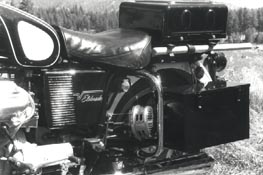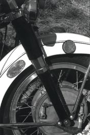 After powder coating, chroming, rebuilding and polishing, the re-assembly process began. Gosh! What a great feeling it is to see the object of your sweat and toil finally begin to take shape! Steve Payne and I refitted the engine and transmission to the bike and fired it up. What glorious motor music was emitted from that twin - even if the mufflers weren't yet affixed! Steve was able to procure red lights, a radio antenna and a pair of old "Dietz" rear turn signals. I had the siren's kick pedal fabricated (Let me know if you have an original.) and it all went together with relatively few problems.