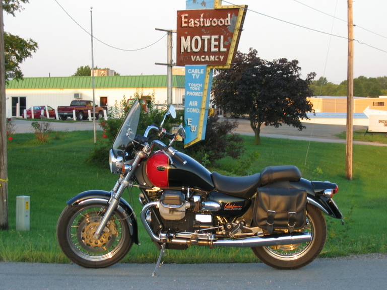 After dinner, I wiped down the Guzzi and went straight to bed, as I had an early appointment with Ace in St. Joe. The next morning, on the way out, I snapped a picture in front of the "Bates."